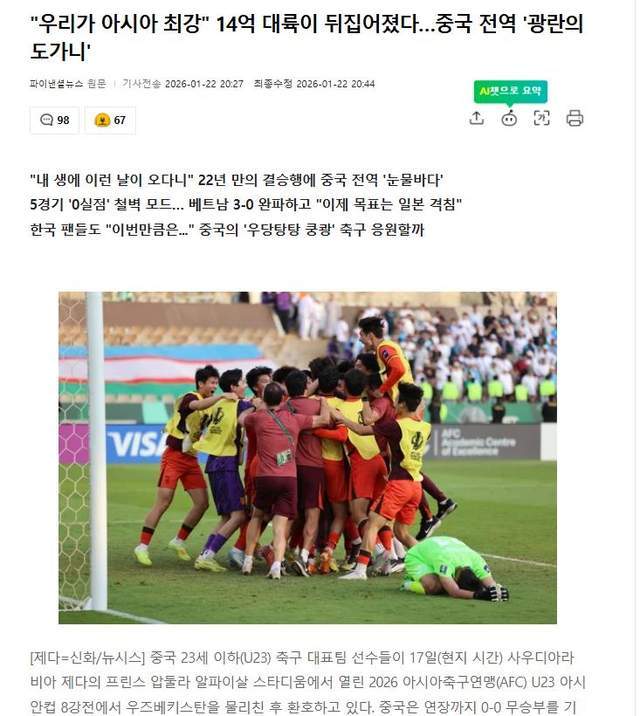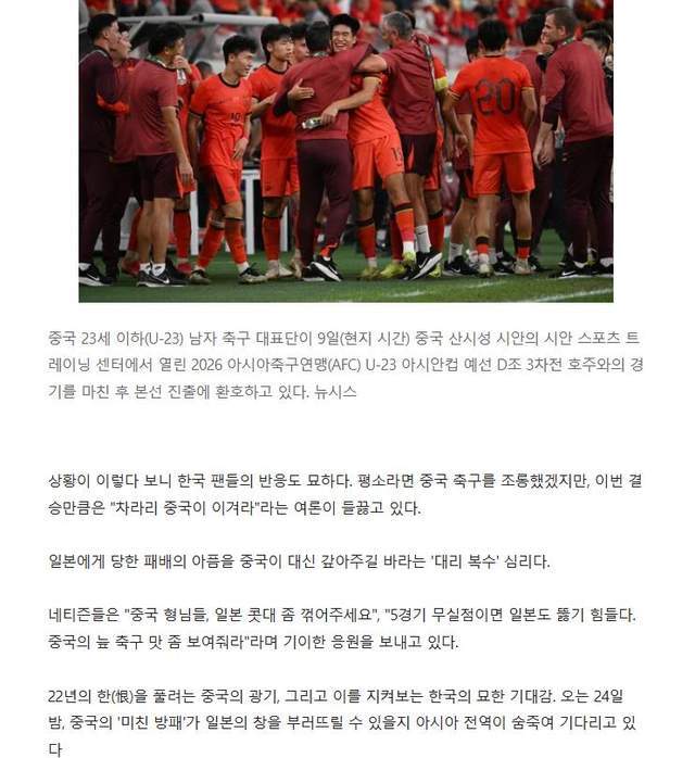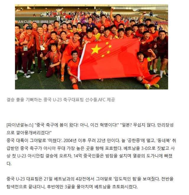 韩国媒体先是展望了中国队即将参加U23亚洲杯的情况,说这支从04年之后,时隔22年首次进入亚洲决赛的球队,曾经饱受恐韩症困扰,但如今却已经向亚洲巅峰迈进,如今的中国队已经不再是当年我们熟悉的“少林足球”,安东尼奥的窒息式防守让人胆寒,5场比赛一球没丢,他们即将在决赛中面对击败韩国的日本队。