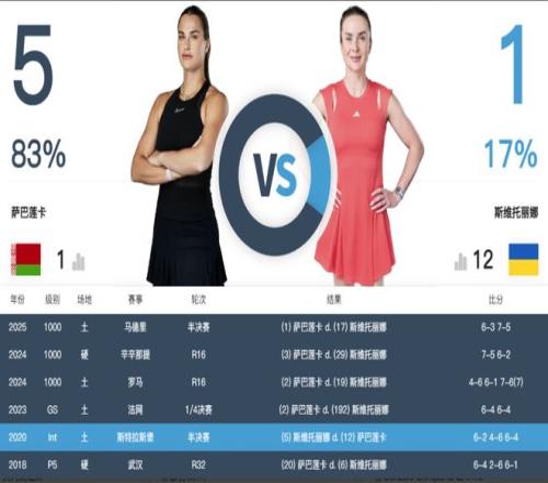双方交手记录另一个值得关注的是6次交手大多发生在红土场,唯二的两次硬地对垒都是萨巴笑到了最后。2018年武汉公开赛,当时萨巴苦战三盘取胜,尽管彼时的白俄罗斯人出众的实力已然冒头,但大赛关键阶段的频频掉链子还是让她饱受质疑。2024年辛辛那提站,萨巴直落两盘击败对手,硬地女皇风采完全显露。
