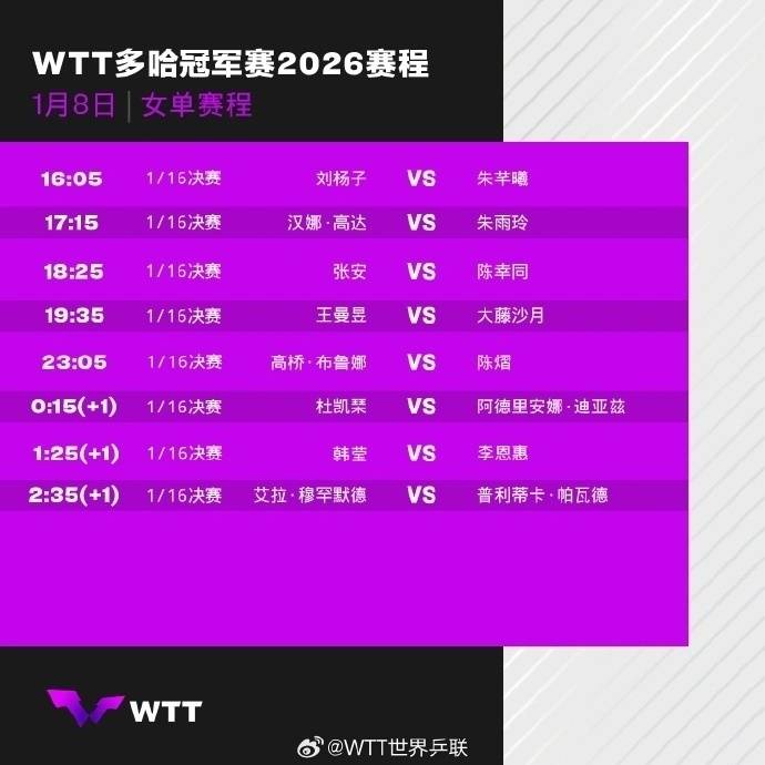 足球直播,欧洲杯直播,体育直播,球客直播,雷速体育,篮球直播,风驰直播,NBA直播,英超直播,足球比分,足球赛事,意甲,欧冠,世界杯,世界杯直播,村超,贵州村超,波胆,角球,串球,大小球北京时间1月8日消息,2026年WTT多哈冠军赛继续进行,CCTV5直播比赛实况。女子单打1/16决赛第二个比赛日,共有王曼昱、陈幸同、陈熠三名女将出战。其中,1号种子王曼昱与日本选手大藤沙月的比赛备受关注(